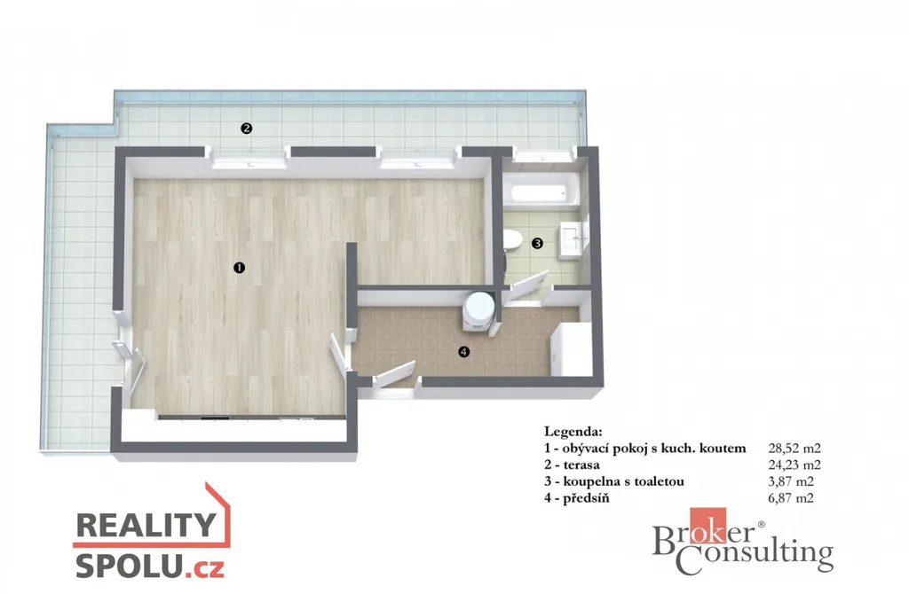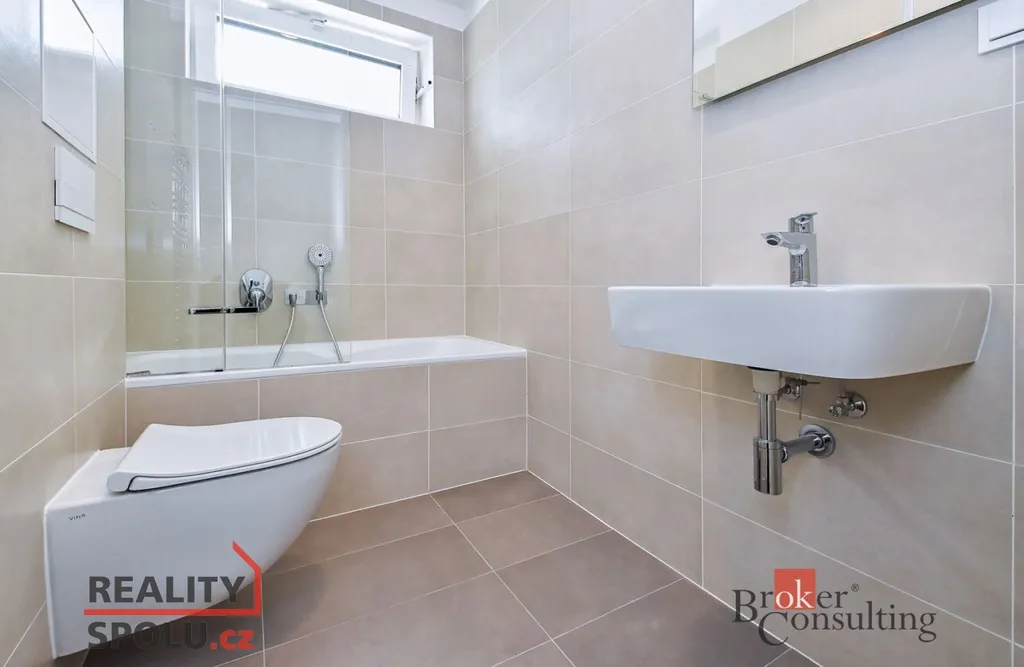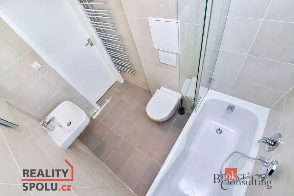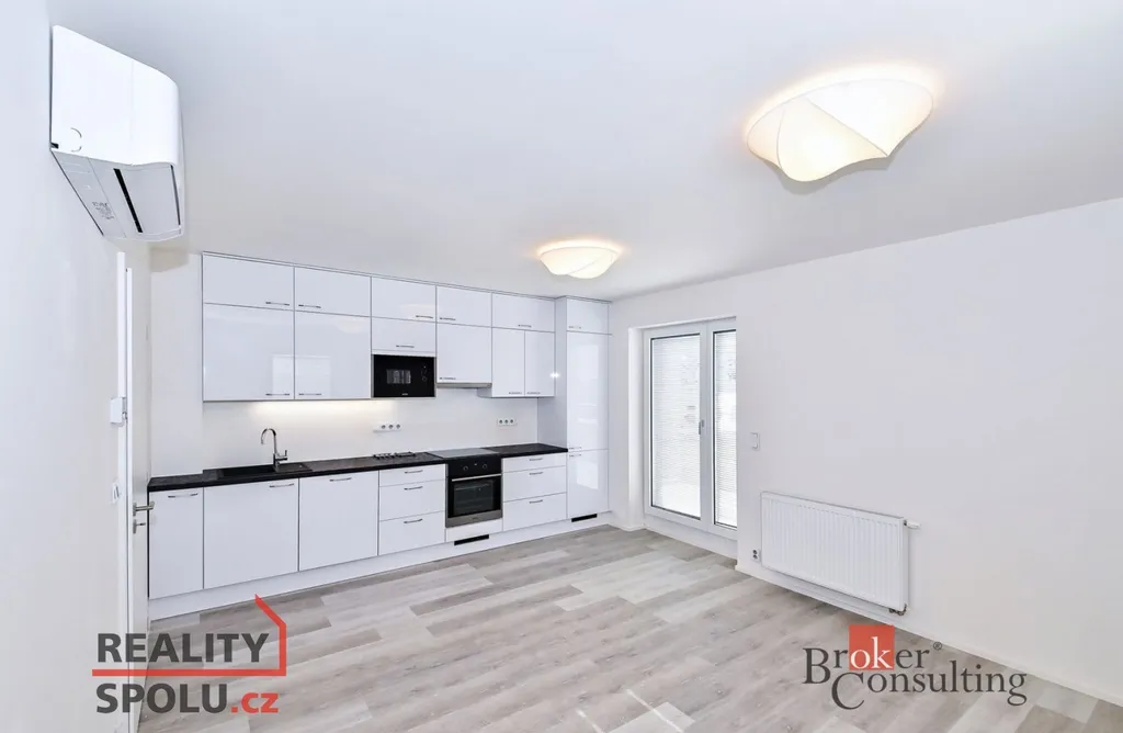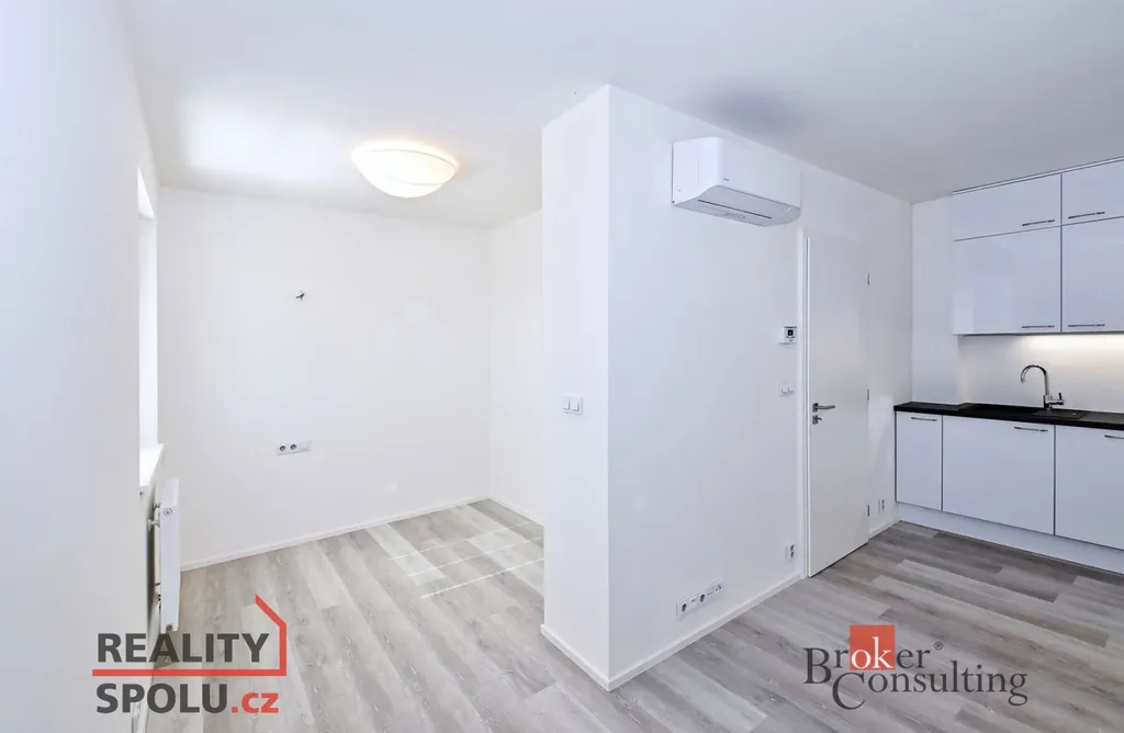 Dispozice: předsíň (6,9 m2), koupelna (3,9 m2), obývací pokoj (29 m2) s kuchyňským koutem a prostorem na spaní ). Kuchyňská linka je vybavena kompletně vestavěnými spotřebiči (lednice s mrazákem, sklokeramická varná deska, el. trouba, myčka, digestoř, mikrovlnná trouba). V bytě je vlastní plynový kotel k vytápění a ohřev teplé vody, což je velkou výhodou, jelikož můžete ovlivnit vlastní spotřebu. Dále v bytě je klimatizační jednotka a v předsíni šatní skříň, na podlaze je vinyl a v koupelně dlažba, okna jsou se žaluziemi a trojskla. Koupelna je světlá s oknem, toaletou, vanou se zástěnou a umyvadlem. Prostor na pračku je v předsíni. K bytu náleží sklep v přízemí domu a parkovací místo v samostatné garáži, již zahrnuto v ceně nájmu.