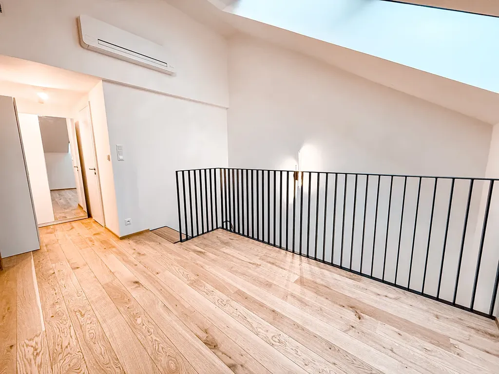 V horním podlaží se nachází galerie, ideální jako spací zóna nebo klidný pracovní kout, a dále koupelna se sprchovým koutem a WC, laděná v moderním, minimalistickém stylu.
