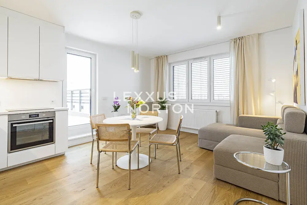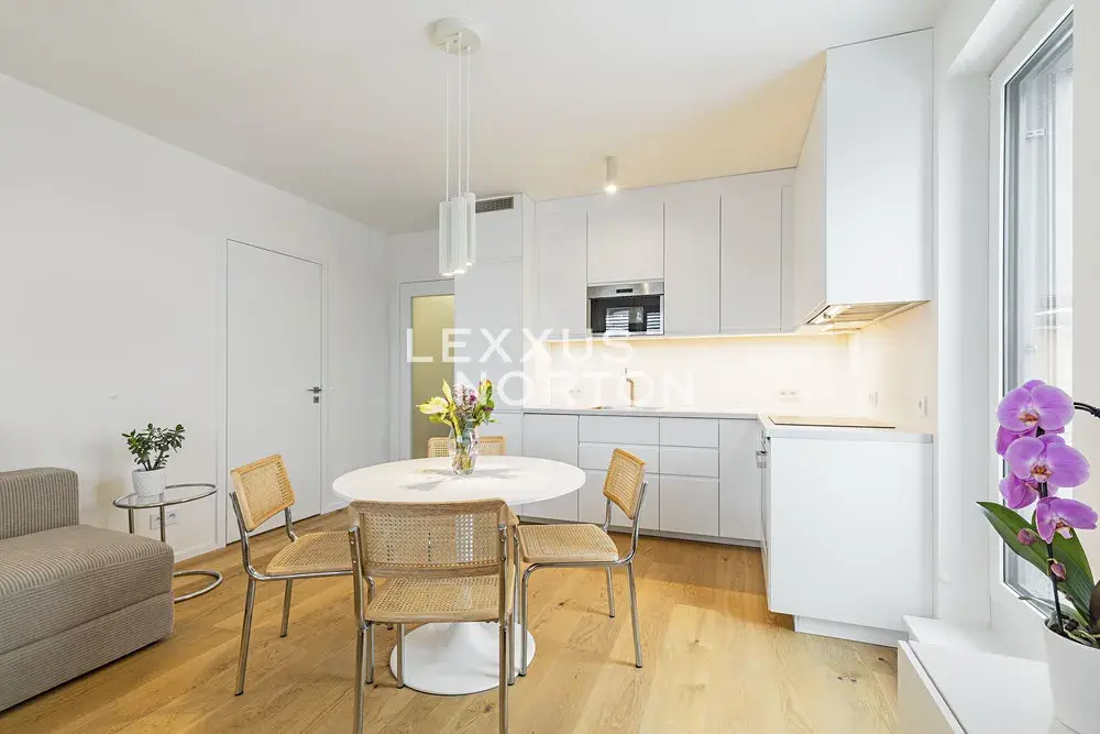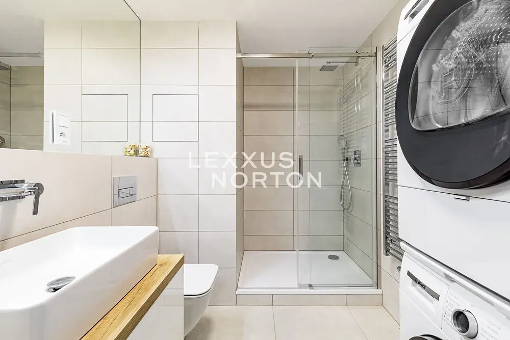 Byt je kompletně zařízený. Kuchyňský kout je vybaven lednicí s mrazákem, varnou deskou, troubou, mikrovlnnou troubou a myčkou nádobí. Koupelna nabízí sprchový kout, pračku, sušičku a kvalitní sanitu značky Villeroy & Boch. Koupelna je navíc vybavena podlahovým vytápěním. V celém bytě jsou instalovány venkovní žaluzie. Podlahy jsou kombinací dlažby a dřevěné podlahy.