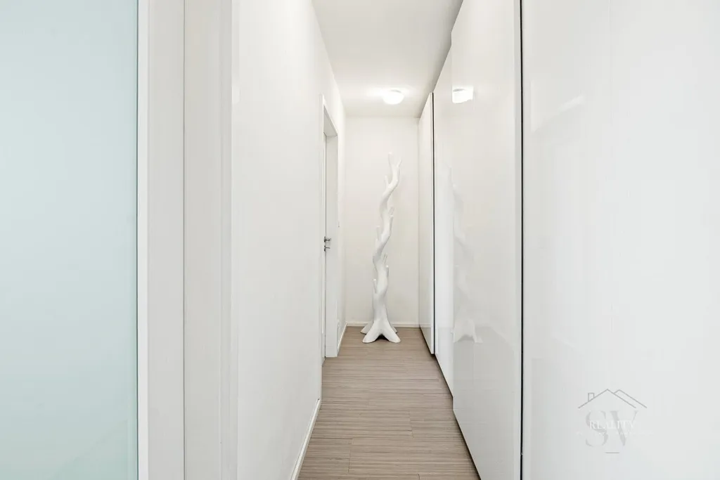 Na podlahách je marmoleum – odolné, tiché a velmi snadné na údržbu. Velkou předností je maximálně využitý úložný prostor: vestavěné skříně v chodbě v bílém lesku včetně botníku, promyšlené úložné prvky v koupelně, pračka je elegantně skrytá ve vestavbě a je zde příprava na sušičku. Interiér tak působí čistě, vzdušně a klidně.