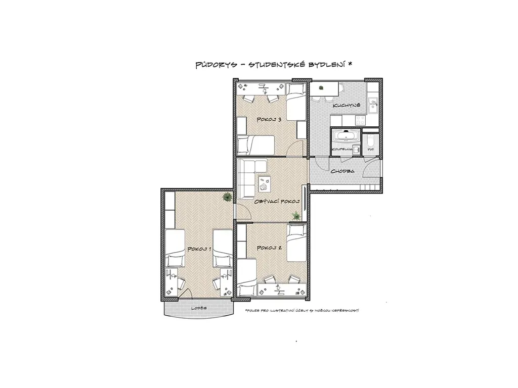 Samotná užitná plocha bytu činí 72 m² a vzhledem ke svému dispozičnímu řešení lze byt využívat i jako 4+1 - viz. ilustrativní půdorysy.