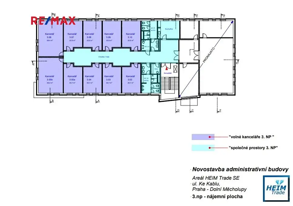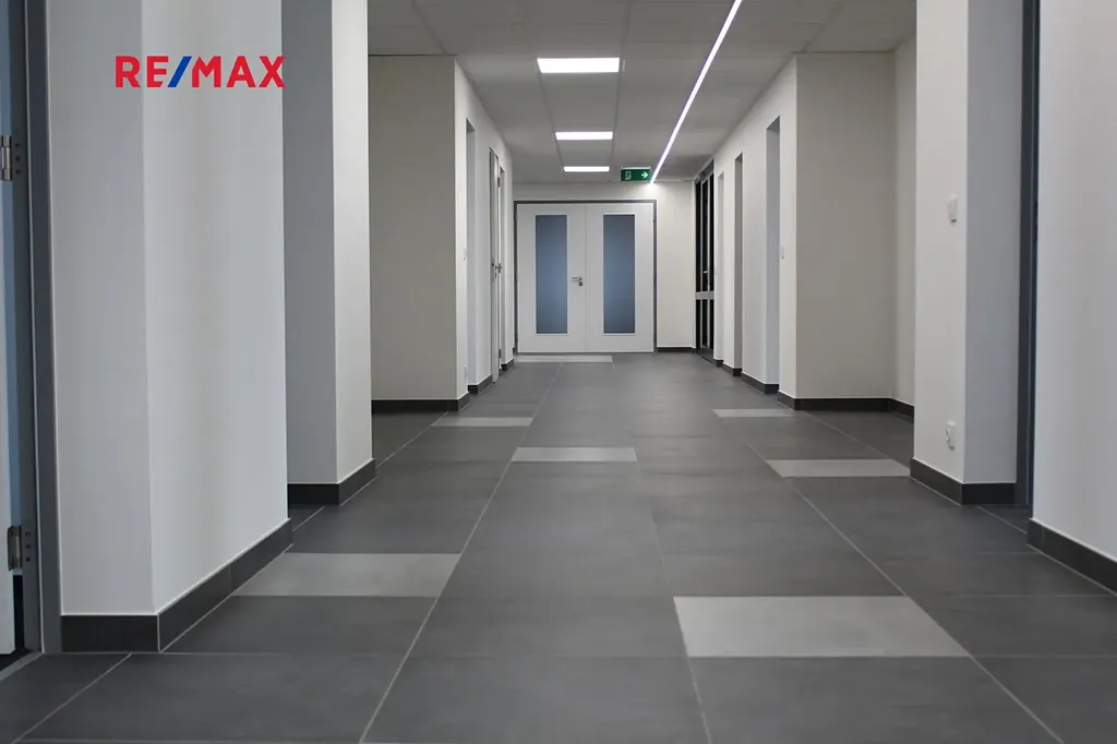 nabízíme Vám nové nevybavené prostory k pronájmu v Dolních Měcholupech (ulice Ke kablu) s okamžitou využitelností. Dohromady se jedná o dvě kanceláře ve třetím nadzemním podlaží (bez výtahu), které se dají pronajmout jako jeden celek, nebo jednotlivě. Společné prostory tvoří chodba/hala, kde se dá po domluvě s majitelem objektu dopronajmout extra prostor u zdí (tzv. niky), který se dá využít např. k trvalému umístění vestavených skříní či tiskáren atp. Další společné prostory tvoří toalety (dámské v bílé barvě a pánské v černé) a kuchyňka.