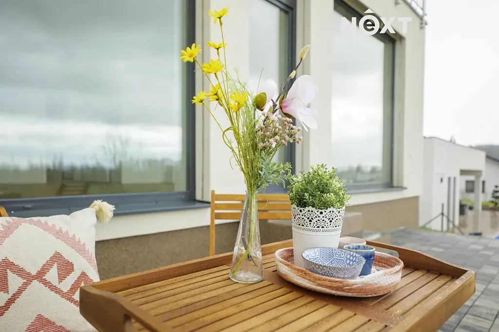 Dominantou bytové jednotky je velkorysý obytný prostor s kuchyní o celkové rozloze 56 m². Díky velkoformátovým proskleným plochám a přímému vstupu na venkovní terasu o výměře 21 m² vzniká přirozené propojení interiéru s exteriérem. Jihozápadní orientace přináší dostatek slunečního světla, klid a otevřené výhledy do okolní přírody. Horní podlaží je koncipováno jako soukromá klidová zóna. Hlavní ložnice o rozloze 24,7 m² disponuje vlastní šatnou (7,1 m²) a vstupem na terasu s výhledem do okolní krajiny. Dva další pokoje o velikostech 21,9 m² a 17,4 m² poskytují dostatek prostoru pro rodinu, děti či pracovnu. Samostatná šatna o rozloze 7,6 m² zajišťuje nadstandardní úložné možnosti a luxusní koupelna s vanou, sprchovým koutem a toaletou (9,8 m²) splňuje vysoké nároky na komfort bydlení. Jednotlivé místnosti propojuje hala o velikosti 24,8 m², jejímž architektonickým prvkem je masivní dubové schodiště, které podtrhuje nadčasový charakter interiéru.
