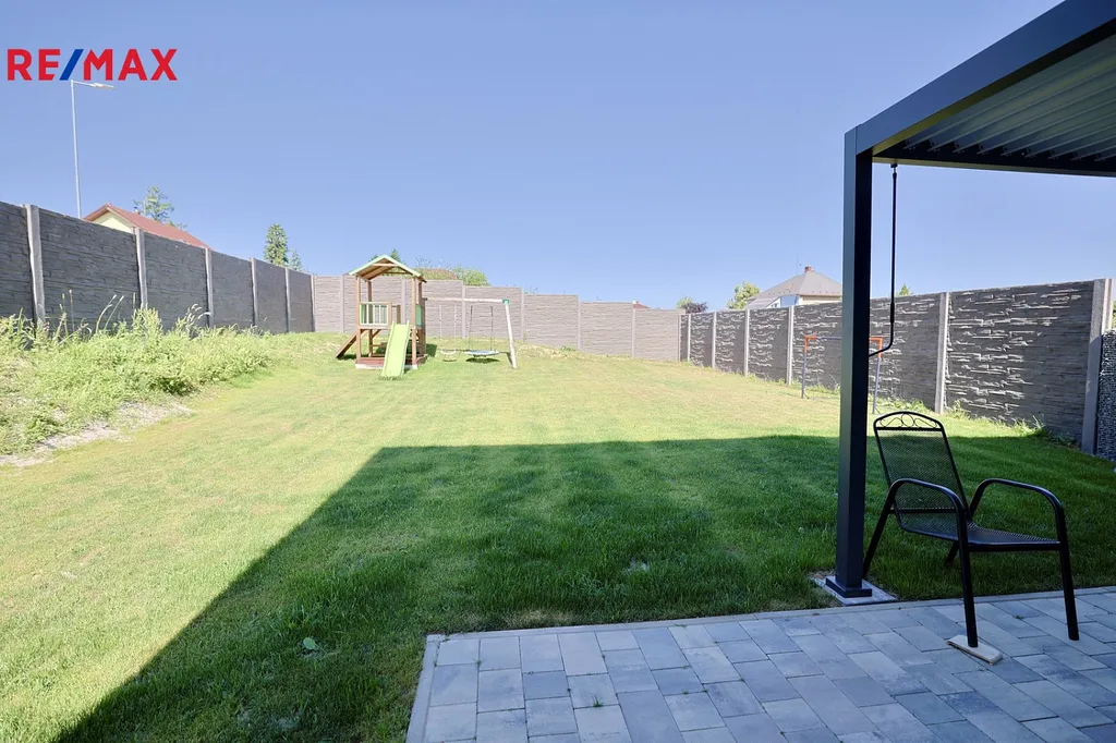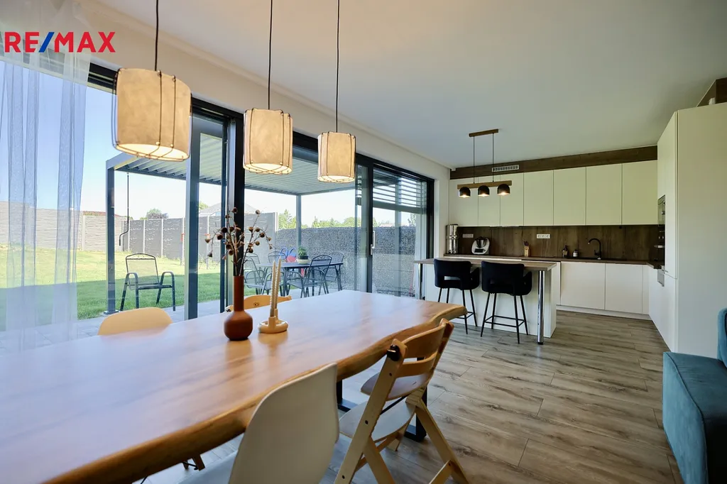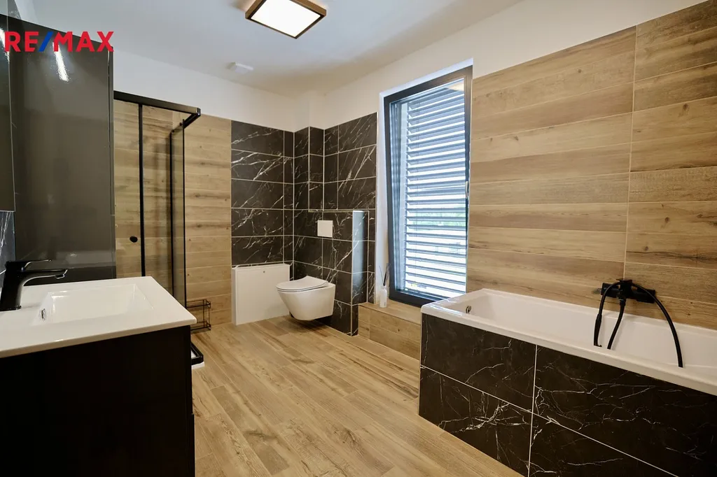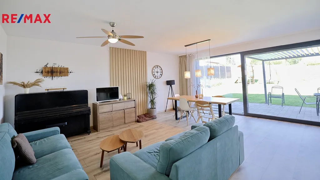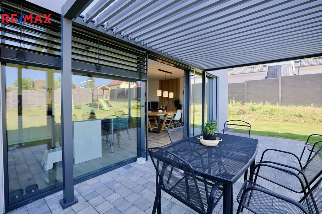 Vytápění tepelným čerpadlem, příprava pro fotovoltaiku, podlahové vytápění, hliníková okna a venkovní žaluzie.