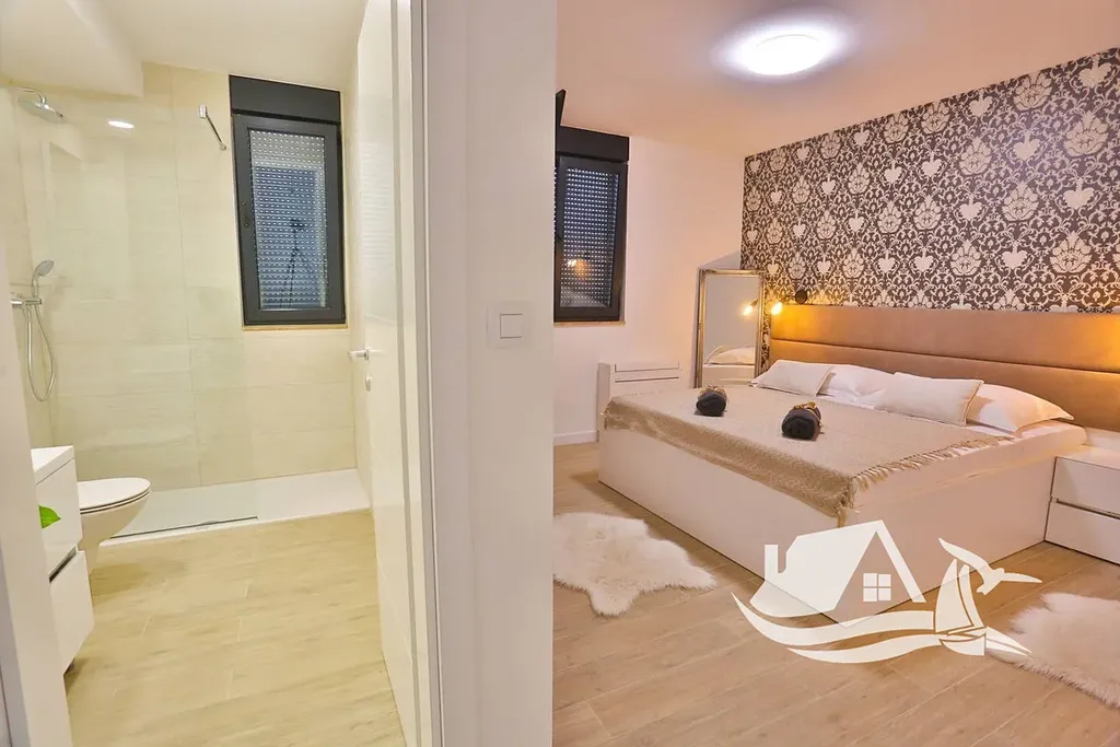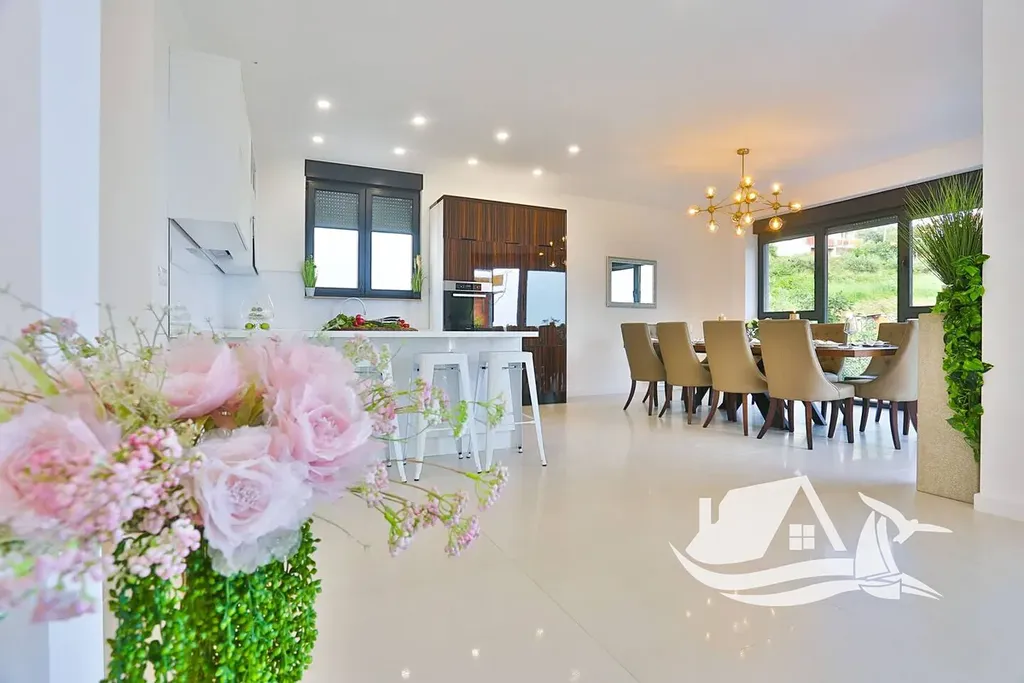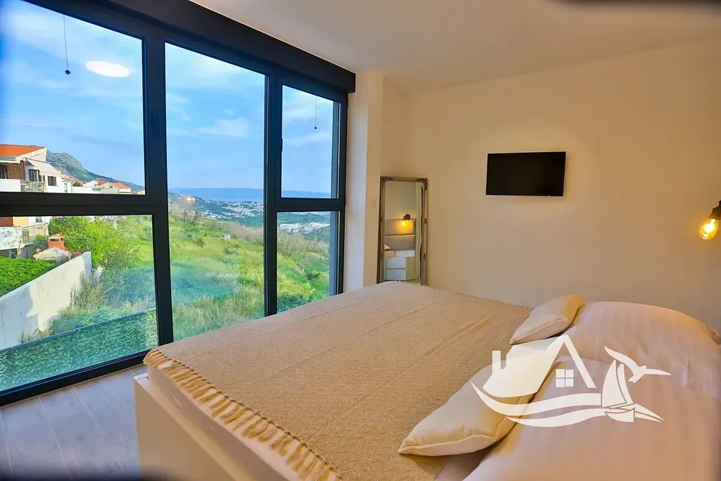 První patro je řešeno jako hlavní obytná část s prostorným obývacím pokojem, velkou kuchyní a jídelnou. Z tohoto podlaží je přímý vstup na terasu s otevřeným výhledem na moře a Split, který se stává přirozenou dominantou celého domu. Druhé patro nabízí čtyři ložnice, každou s vlastní koupelnou a výhledem na moře, což zajišťuje maximální komfort a soukromí pro rodinu i hosty.