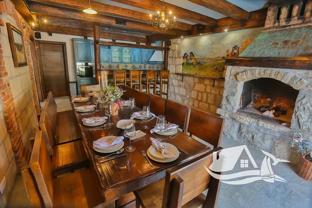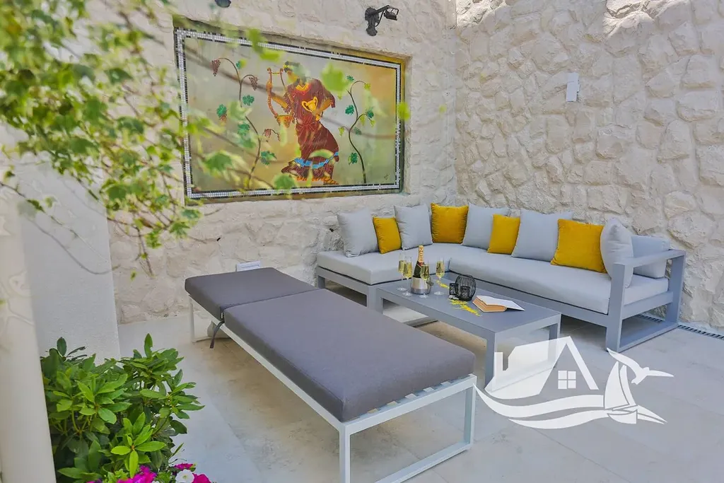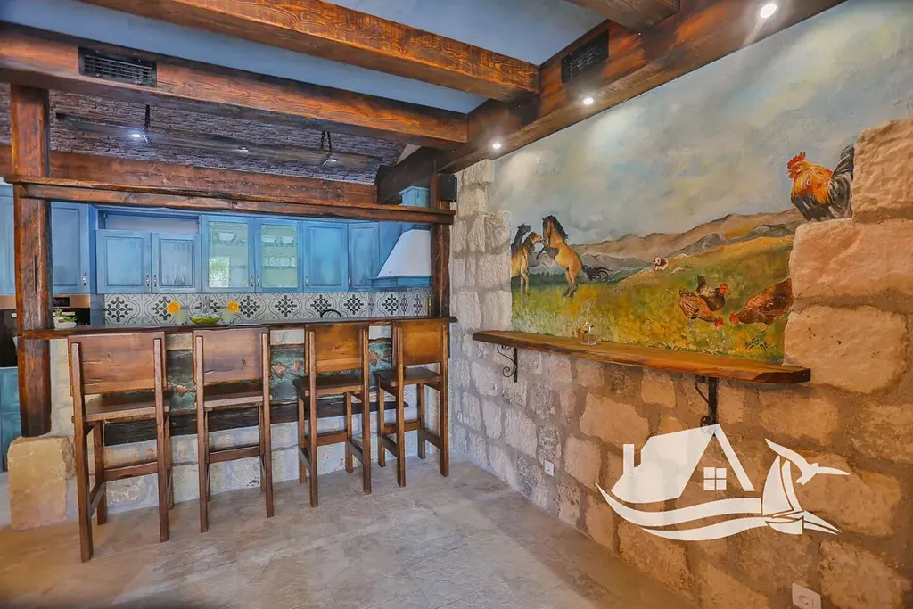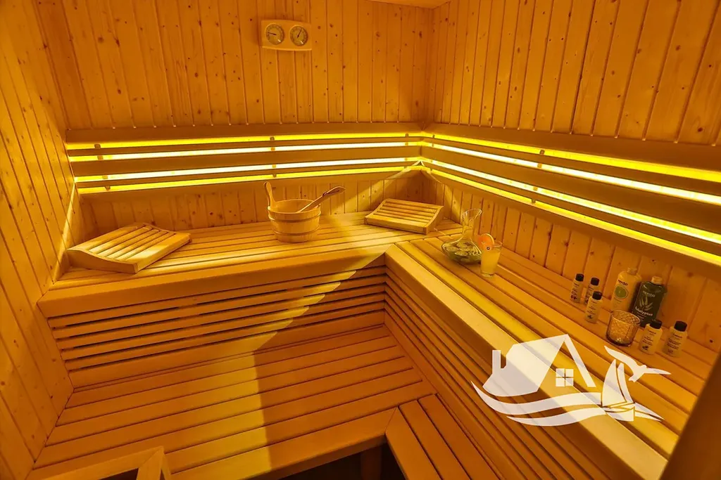 V přízemí o velikosti zhruba 100 m² se nachází tradiční konoba, wellness zóna se saunou, posilovna a místnost určená pro multimediální zábavu. Tento prostor plynule navazuje na velkou terasu s bazénem o rozloze 40 m² a pečlivě upravenou zahradu se středomořskou vegetací, palmami a venkovním grilem, která vytváří ideální zázemí pro odpočinek i společná setkání.