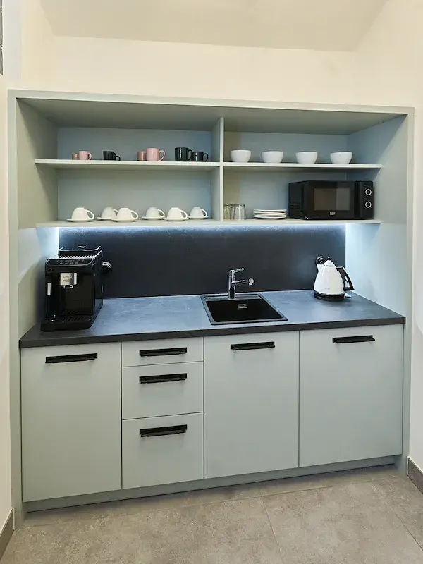 Ve společné části je k dispozici vše, co ke každodennímu pracovnímu životu potřebujete, včetně vybavené kuchyňky a sociálního zázemí.