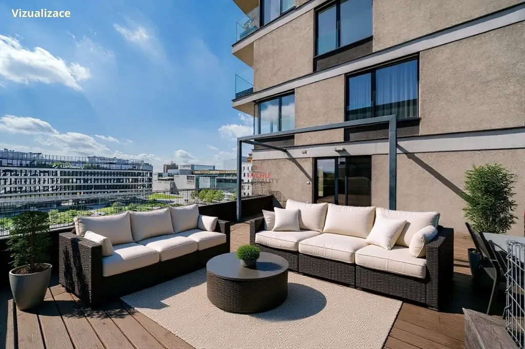 Nabízíme tento světlý, vzdušný a prostorný byt o dispozici 3+kk na nám. Biskupa Bruna v klidné části Rezidence Nová Karolina. Byt (103 m2) disponuje terasou (53 m2) a lodžií (5 m2), rohovým garážovým parkovacím stáním (27 m2), kde je možno parkovat až 2 auta a dvěma úložnými kójemi, které s parkovacím stáním sousedí.