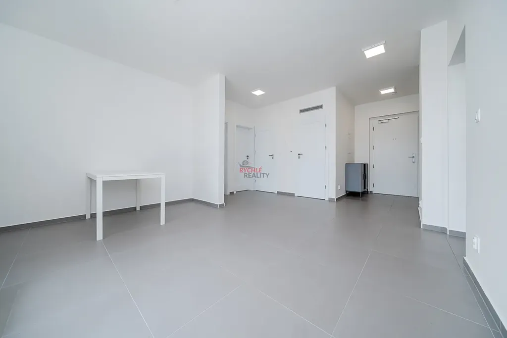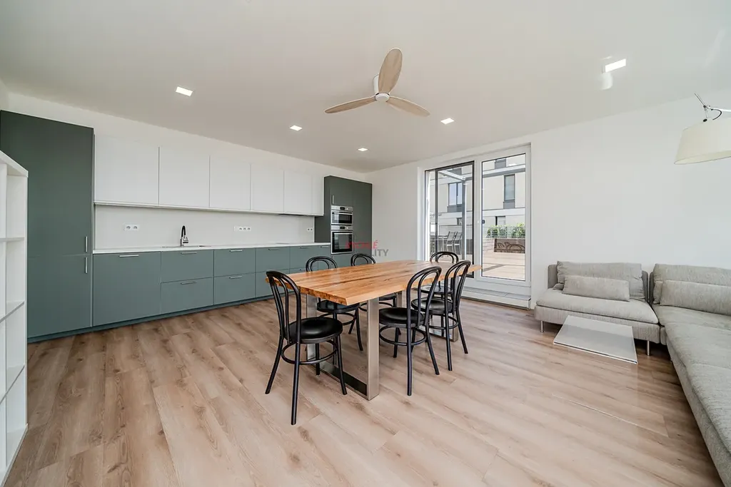 V bytě jsou pak další dvě samostatné ložnice, koupelna se sprchovým koutem, vanou i toaletou, další samostatná toaleta, komora (kde jsou umístěny pračka se sušičkou) a velkorysý obývací prostor s kuchyňským koutem se vstupem na terasu i lodžii.