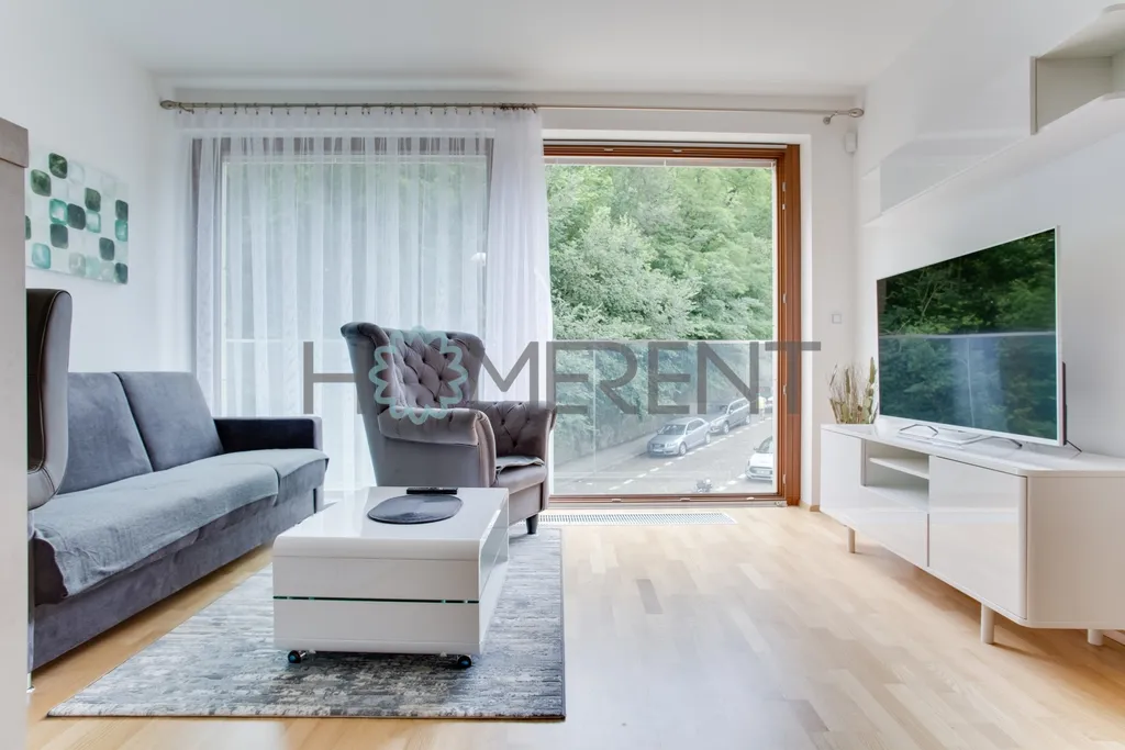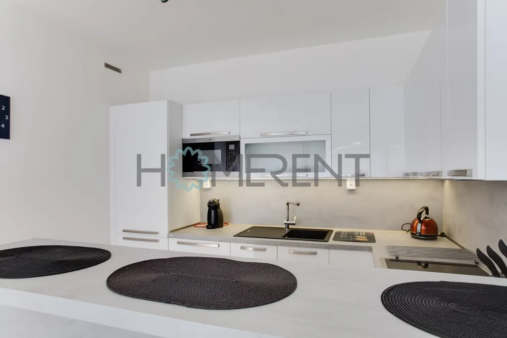 Dominantou bytu je světlý obývací prostor s velkými okny a přímým vstupem na balkon orientovaný do zeleně, ideální místo pro ranní kávu nebo večerní relax. Kuchyň je elegantně řešená, plně vybavená všemi spotřebiči a doplněná o stylové barové sezení, které přirozeně propojuje kuchyň s obývacím pokojem.