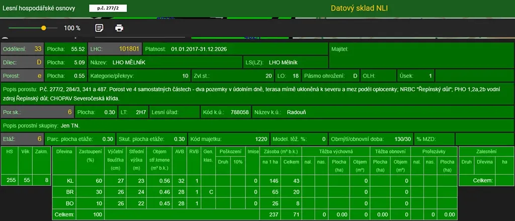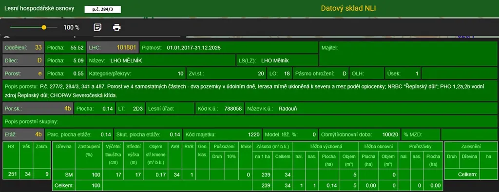 Jedná se o p.č. 277/2 vedená jako lesní pozemek o celkové výměře 2 966 m2, zastoupení dřevin dle LHO javor, bříza, borovice, stáří lesa 63 let.