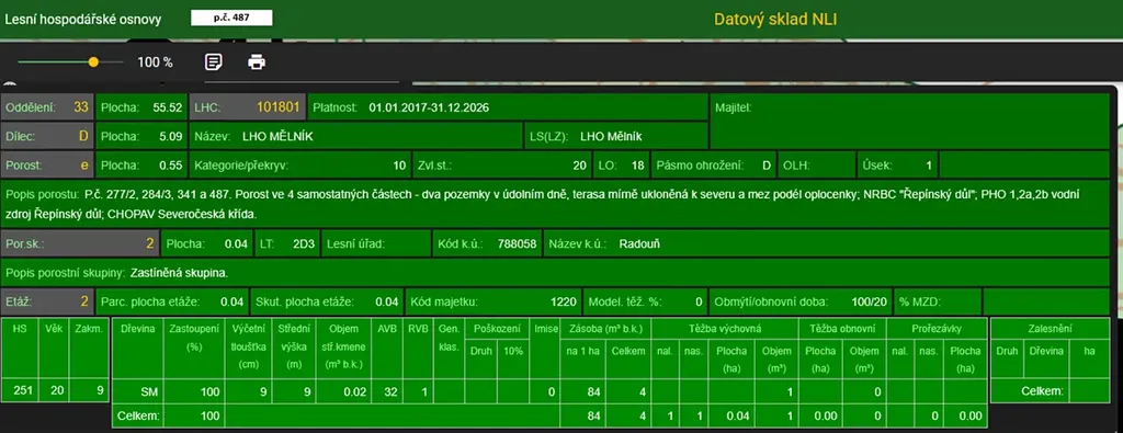Dále se jedná o p.č. 487 vedená jako lesní pozemek o celkové výměře 737 m2, zastoupení dřevin dle LHO smrk a javor, stáří lesa 42 let.
