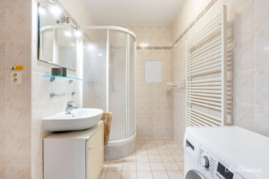 V koupelně se nachází sprchový kout, toaleta, umyvadlo s umyvadlovou skříňkou, zrcadlo, topný žebřík a pračka.