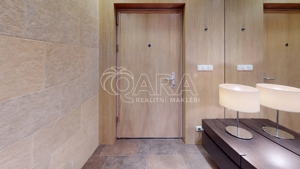 Byt je zařízen kvalitními materiály (parkety, italská dlažba, velká okna s žaluziemi) a nábytkem. K dispozici je pračka i TV. K bytu náleží sklep (3,1 m2) a dvě parkovací stání v podzemních garážích, která jsou již zahrnuta v ceně.
