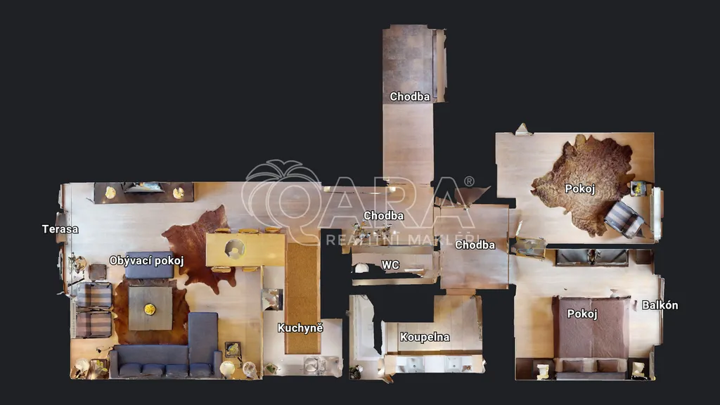 Dva balkony (3,8 m2 a 2,3 m2 přístupné z obývacího pokoje a jedné z ložnic).