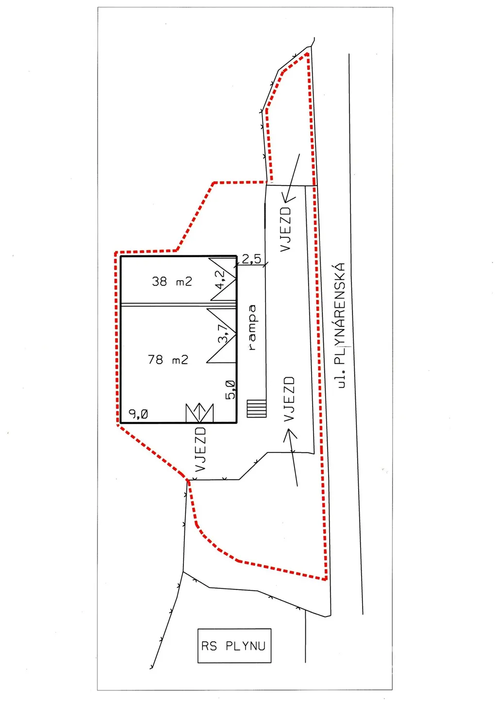 výška 5m, betonová rovná podlaha, rampa, možnost i bočního vjezdu do haly, příjezd k rampě ze dvou směrů i pro velké nákladní automobily, případně volná další plocha kolem haly, v těsné blízkosti nového nákupního centra.