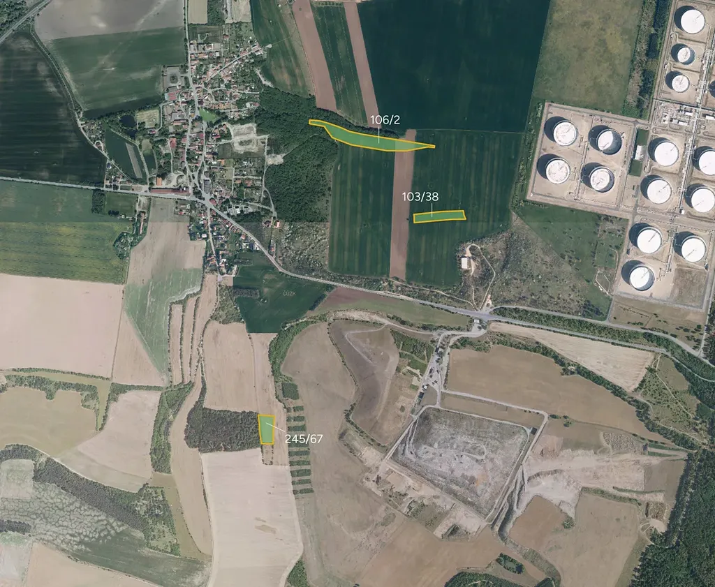 Jedná se o parcely č. 103/38, 106/2 a 245/67 o celkové výměře 25 049 m². Všechny pozemky jsou vedeny jako orná půda a tvoří jeden souvislý celek. Celá výměra je ve 100% vlastnictví a je předmětem prodeje.
