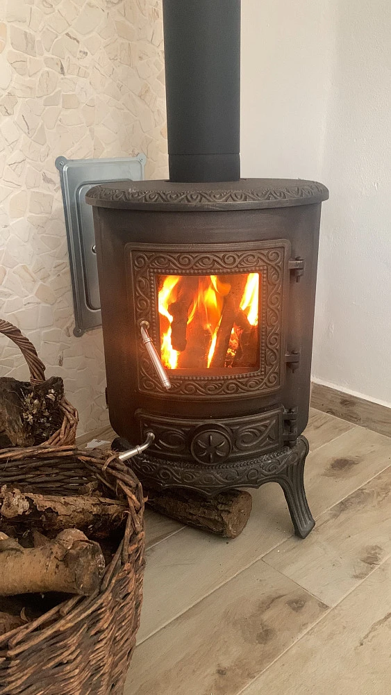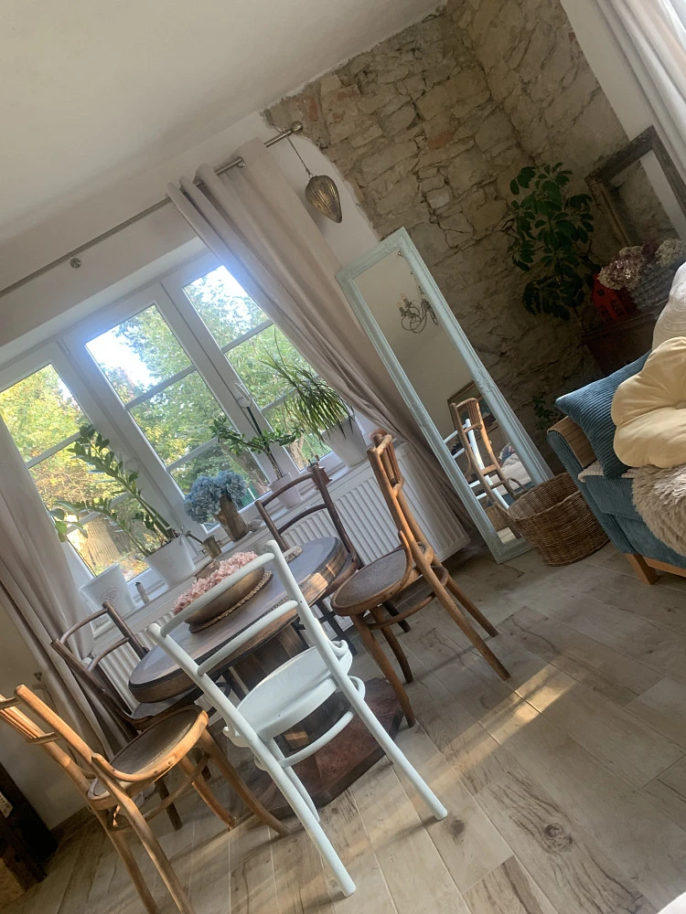 • světlý obývací pokoj s gaučem a posteli, jídelním stolem, krbovými kamny a komodou, dvě velká okna do zahrady