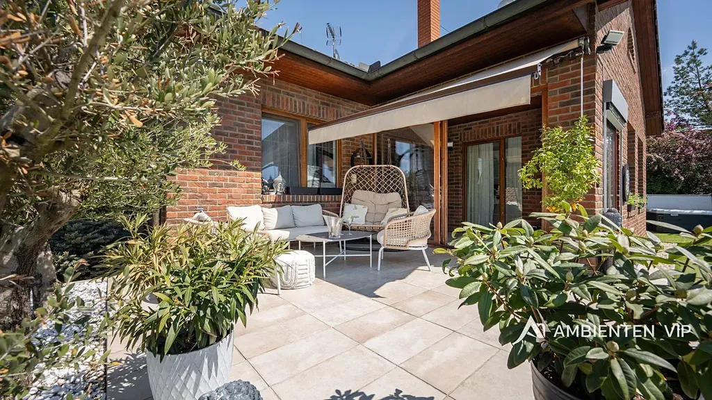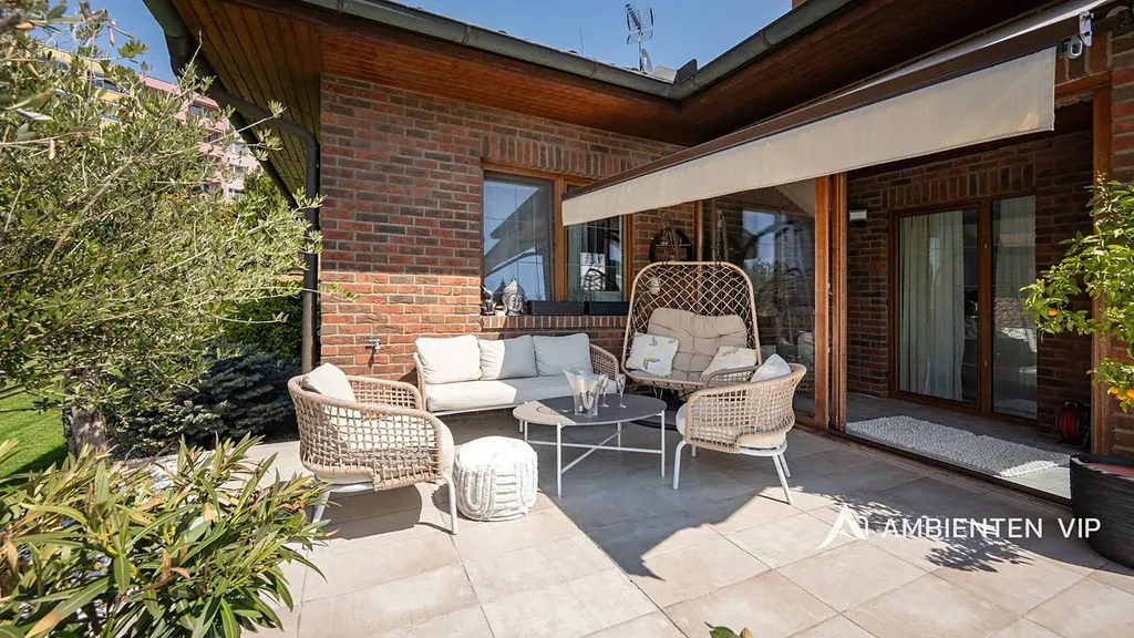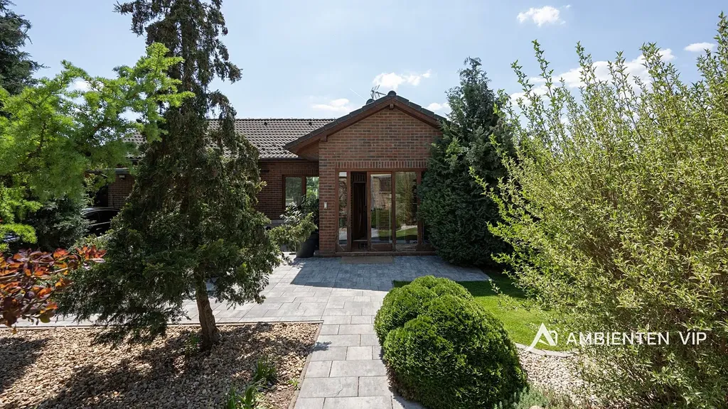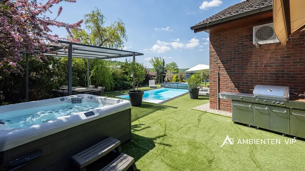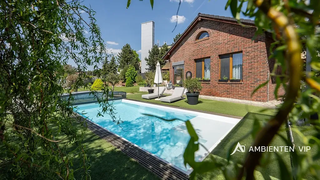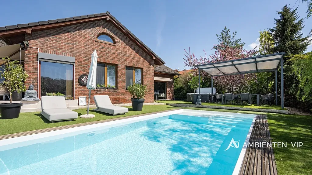 Tato vkusně a moderně zařízená vilka po rekonstrukci vás okouzlí nejen interiérem, ale i prostornou zahradou skýtající různé formy využití. Vstup do domu je přes prosklené zádveří, ze kterého vstoupíte do vzdušné světlé předsíně, která je obložená moderními panely s mramorovou texturou s velkorysým úložným prostorem a vstupem do téměř všech místností domu. Po levé straně naleznete průchod do prostorné šatny s ostrůvkem, přes kterou se prochází do luxusní ložnice. Ta má přímý výstup k bazénu a vířivce. Dominantou ložnice je na zakázku vyrobené dvojlůžko, samostatně stojící vana, umyvadlo a projektor s plátnem. Přímo z postele ložnice máte nádherný pohled do okrasné zahrady. Plátno projektoru lze využít i jako roletu. Otevřená dispozice obývacího pokoje, kuchyně a jídelny je příjemným prostor pro vaši rodinu. Kuchyňská linka je od firmy Mikyska. V rámci obývacího pokoje můžete spočinout na značkové sedačce, využít jídelní stůl s designovými židlemi či připravit pro rodinu výborné menu za pomoci moderních spotřebičů, většinou značky Miele. Za zmínku stojí varná část kuchyně nabízející Combi set pro pánev Wok a přípravu čerstvých paniny. Při přípravě pokrmů, stejně jako při relaxaci na sedačce můžete pozorovat život na zahradě, která obklopuje celý dům. Z obývací části je vstup na prostornou terasu až ke krytému bazénu se slanou vodou a protiproudem. Odpočinkovou zónu vkusně doplňuje vzrostlá středomořská vegetace v elegantních květináčích. Pokud se vydáte z předsíně vpravo, zavítáte do jednoho z dětských pokojů. V budoucnosti lze i tento pokoj propojit s terasou a přímým vstupem na zahradu. Vedle dětského pokoje se nachází technická místnost s pračkou a sušičkou a dále vstup do koupelny s toaletou a sprchovým koutem a dvěma umyvadly. Vytápění domu je přes plynový kotel Baxi. V přízemí domu je podlahové vytápění. Ve druhém patře domu se nachází dětský pokoj, který majitelka vkusně vyzdobila dětskou tapetou a vytvořila pohádkové království pro vaše děti. Celá zahrada je oplocená dřevěným plotem. Nabídne vám prostor, jak pro váš odpočinek, tak lze i část zahrady využít jako druhé stavební místo. Na pozemku máte soukromí, jelikož je zeleň v zahradě poměrně vzrostlá. Na zahradě se nachází domek na nářadí a herní plocha pro děti. Zdivo domu je cihla s obkladem Klinker. Okna jsou plastová s izolačním dvojsklem. Rodinný dům prošel nákladnou rekonstrukcí, která se uskutečnila v roce 2021 a 2024.