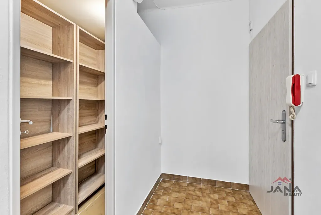 Byt má dobře řešené uspořádání. Prostorná předsíň s praktickou komorou zajišťuje vstup do všech místností, které jsou neprůchozí. Kuchyně má vstup na lodžii a je vybavena myčkou nádobí, digestoří a kombinovaným sporákem (plyn, elektřina). Dále se zde nachází obývací pokoj, ložnice, dětský pokoj, koupelna s vanou a samostatné WC.