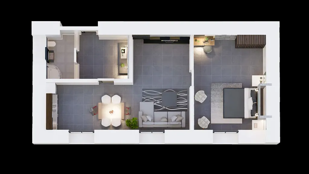 Po vstupu do bytu vás přivítá prostorná chodba s koupelnou. Z chodby se vchází do obývacího pokoje s kuchyní, která je skvěle rozvržena tak, že obytná část je situována dál, což zajišťuje soukromí. K dispozici je také samostatná ložnice, která poskytuje komfortní bydlení.