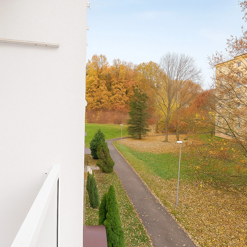 Dispozice bytu nabízí prostorný obývací pokoj s přístupem na balkon, samostatnou ložnici, kuchyň, koupelnu, WC a vstupní chodbu. K bytu náleží sklepní kóje.