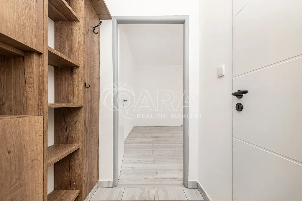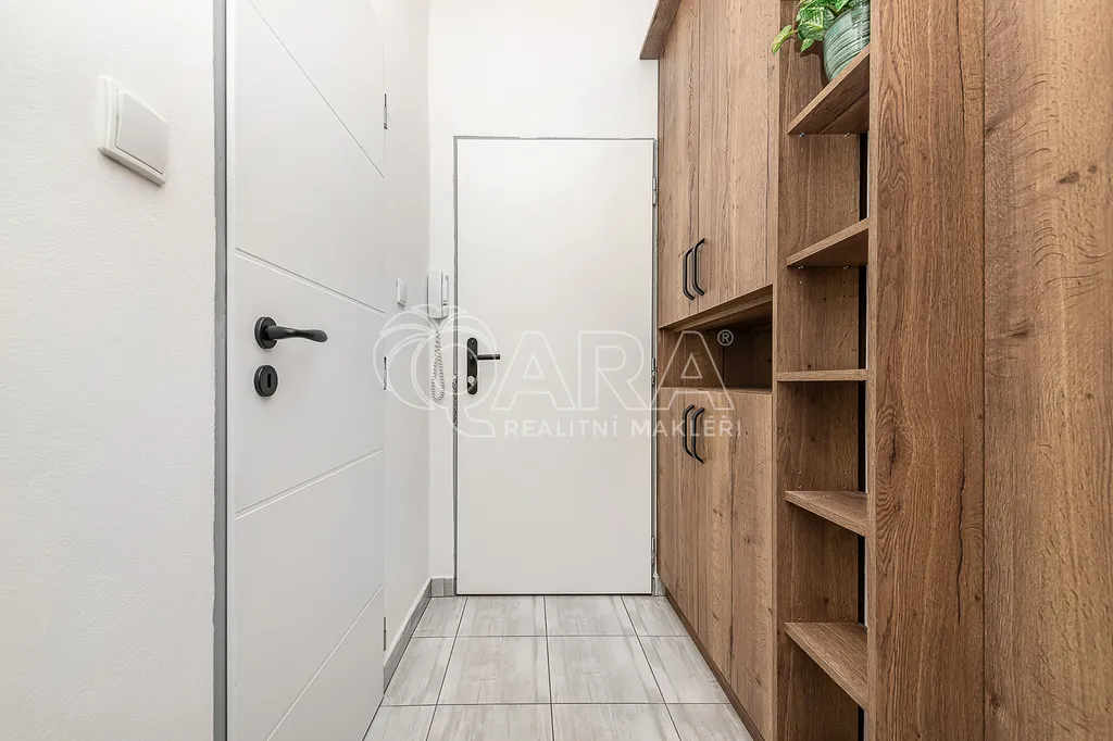 Stav po kompletní rekonstrukci: V bytě jsou nové podlahy, čisté omítky, modernizovaná koupelna a nová kuchyňská linka se sklokeramickou dvouplotýnkou. Na chodbě pak najdete praktické police vyrobené na míru.