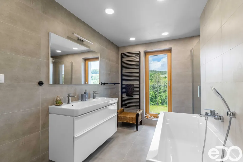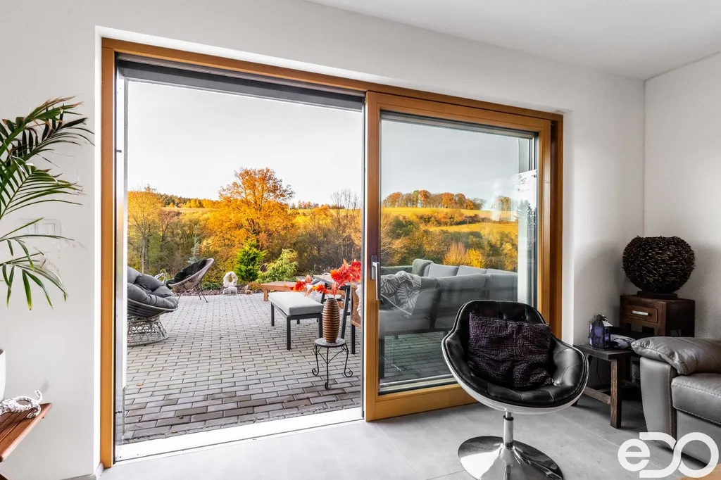 Pokud jste někdy hledali opravdu klidné místo k bydlení, tady ho najdete. Široko daleko nenajdete větší ticho a přitom jste jen 30 minut od Prahy. Ve Zvánovicích na vás čeká novostavba rodinného domu 5+kk o užitné ploše 162 m², obklopená nekonečnou přírodou Voděradských bučin. Klid, prostor a čistý vzduch – ideální pro každého, kdo hledá skutečné útočiště mimo městský ruch, a to v úspornější variantě s menším pozemkem. Z obývacího pokoje se otevírá krásný výhled do okolní přírody. Velké HS portály z kombinace dřeva a hliníku zajišťují nejen dostatek světla, ale i výbornou tepelnou a zvukovou izolaci. Všechna okna i dveře jsou z prvotřídních materiálů a vybavena trojskly.