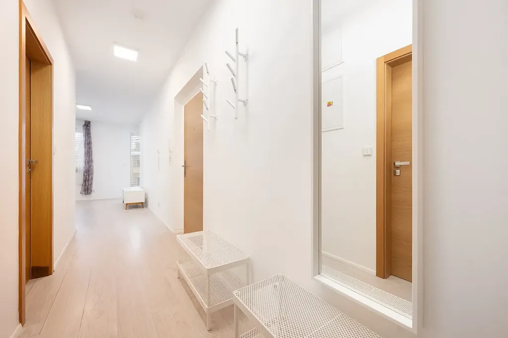 Po vstupu do bytu se nachází předsíň s botníkem a věšákem, která slouží jako centrální rozcestí bytu. Z předsíně je vstup do obývacího pokoje s kuchyňským koutem, který tvoří hlavní obytný prostor. Obývací část je vybavena rohovou sedací soupravou, jídelním stolem a čtyřmi židlemi. Kuchyňská linka na míru je kompletně osazena sklokeramickou varnou deskou, vestavnou troubou, odsavačem par, myčkou, lednicí s mrazákem, dřezem, kuchyňskou baterií a LED podsvícením. Z obývacího pokoje je přímý vstup na balkon, orientovaný do klidného vnitrobloku. Z boční strany se nachází okolní zástavba, čelním směrem je otevřený výhled na hrad Špilberk. Balkon je vybaven dvěma dřevěnými židlemi a venkovním stolem a nabízí příjemné místo pro posezení.