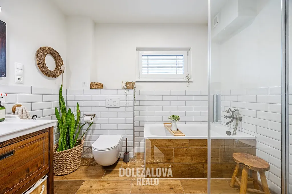 Dále se zde nachází tři samostatné pokoje, koupelna s vanou i sprchovým koutem a praktické zázemí domu.
