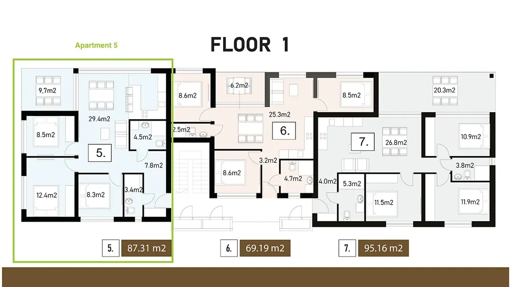 Apartmán č. 5 o ploše 87,31 m2 je umístěný ve druhém podlaží třípodlažní budovy celkem s 10 apartmány. Apartmán sestává z chodby, úložného prostoru, 2 koupelen, 3 ložnic, obývacího pokoje s kuchyní a jídelním koutem s přístupem na velkou terasu. Dům byl postavený z kvalitních stavebních materiálů, je zateplený a v každé místnosti je klimatizace. K apartmánu náleží 2 parkovací stání.