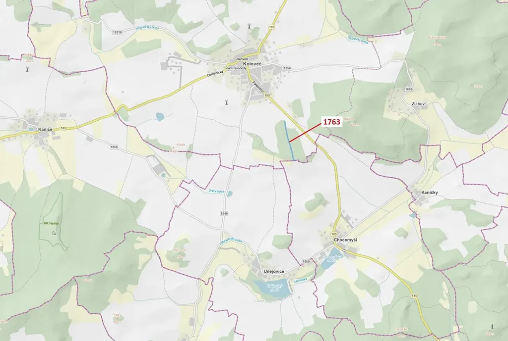 Lesní pozemek o výměře 7329 m2, parcelní číslo 1763, podíl 1/1, katastrální území Koloveč, obec Koloveč, obec s rozšířenou působností Domažlice, okres Domažlice, Plzeňský kraj. Po těžbě.
