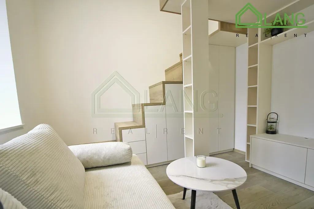 Obývací pokoj s obývací stěnou, spacím patrem a důmyslným úložným prostorem zabudovaným ve schodech do patra dále nabízí pohodlné posezení na elegantním gauči v tónech laděných ke konferenčnímu stolku a zbytku nábytku. Spací patro je dost velké pro dvě osoby, je vybaveno pohodlnou matrací s chráničem.