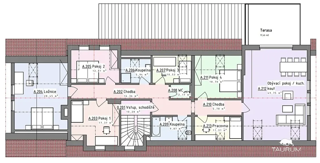 > Podkroví – 172 m² (již dva zbudované pokoje, možnost rozšíření)