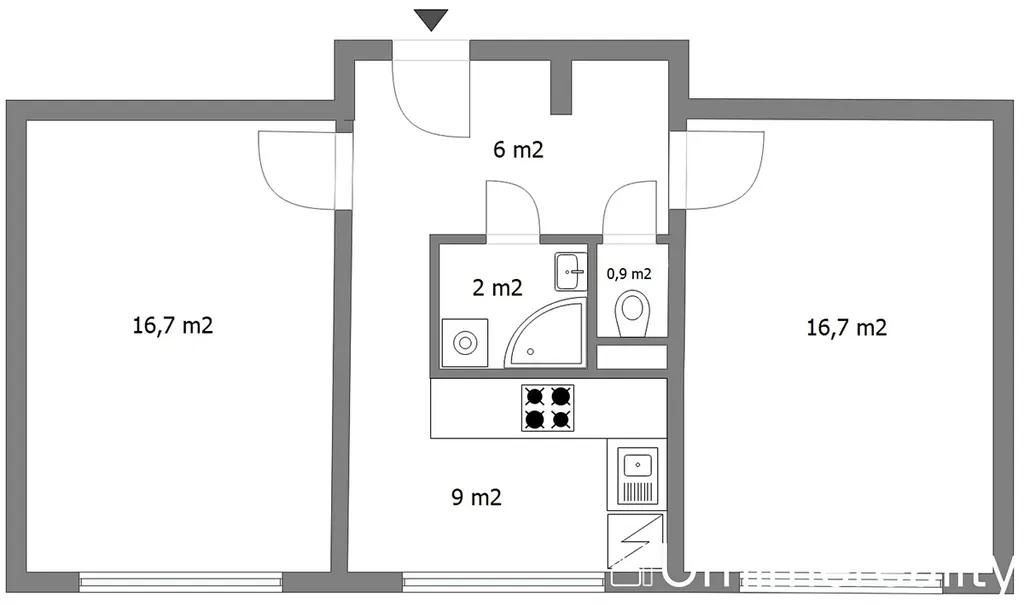 Byt má užitnou plochu 55 m2 a sestává z předsíně, dvou pokojů, kuchyně, koupelny a WC.