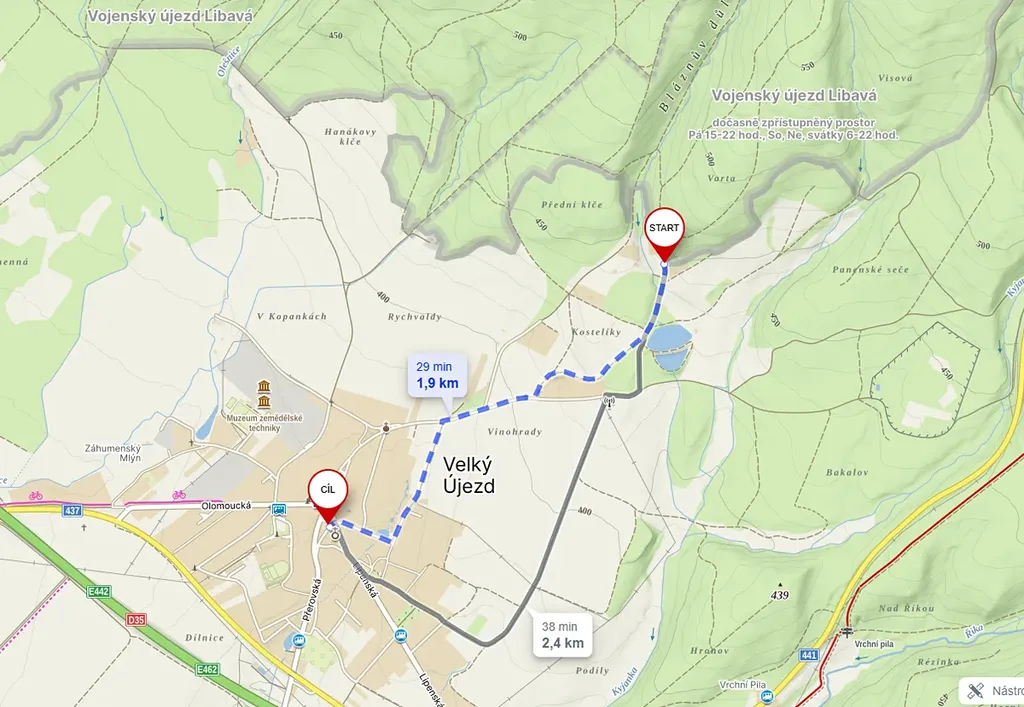Přerov: cca 17–24 km od Velkého Újezdu směrem na jih-jihovýchod