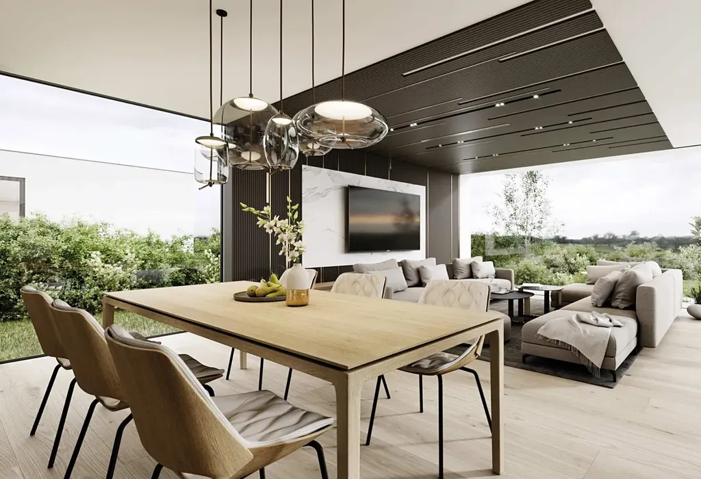 Nemovitost je nabízena ve stavu Shell & Core, který umožňuje budoucímu majiteli přizpůsobit finální podobu interiéru. Hlavní obytné podlaží je koncipováno jako velkorysý otevřený prostor s obývacím pokojem a kuchyní, doplněný o pracovnu, samostatnou toaletu a přímé propojení s garáží i technickým zázemím domu. Bezprahový HS portál přirozeně navazuje obytnou část na budoucí terasu a zahradu orientovanou do volného prostoru. Klidová zóna zahrnuje hlavní ložnici s vlastní koupelnou a šatnou, dva dětské pokoje a samostatnou koupelnu, přičemž ze všech pokojů je zajištěn přímý vstup na zahradu. V horním podlaží se nachází prostorný multifunkční pokoj, pokoj pro hosty, koupelna s toaletou a terasa s plánovanou zelenou střechou. Obytné místnosti jsou orientovány tak, aby poskytovaly ničím nerušené výhledy do okolní zeleně.