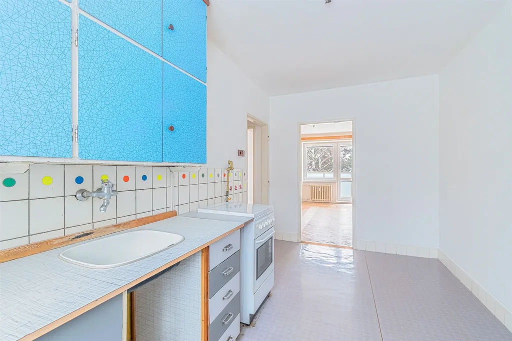 Prostorný dobře prosvětlený byt o celkové ploše 57 m2 se nachází v 1. patře cihlového bytového domu na ulici 9. května. Za vstupem do bytu je z prostorné vstupní chodby přístup do koupelny a samostatného WC. Okna obou pokojů směřují na jihozápad, před okny zeleň. Z obývacího pokoje výstup na nový prostorný balkón. Obývací pokoj navazuje na východně orientovanou kuchyň s jídelním koutem. K bytu patří dva sklepy o ploše 3,5 a 3 m2.