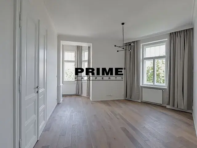 Kompletně zrekonstruovaný, exkluzivní, 2 ložnicový, klimatizovaný, ZAŘÍZENÝ byt se 2 koupelnami k pronájmu, 3+kk, 139m2, s garážovým parkovacím stáním, situovaný ve 2. patře kompletně zrekonstruovaného secesního domu s výtahem.