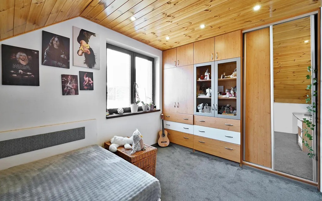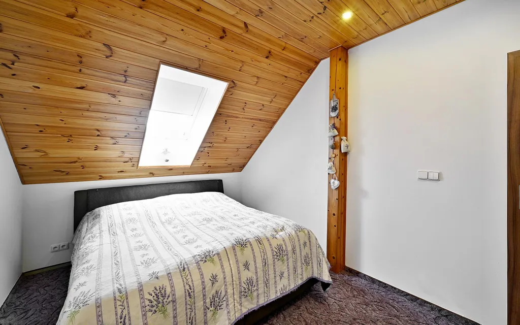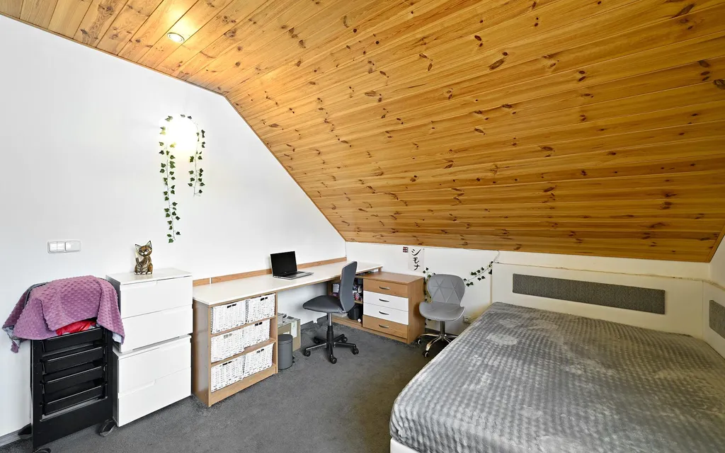V patře se nachází tři ložnice, pracovna a koupelna s rohovou vanou, které poskytují maximální komfort a soukromí. Dispozice umožňuje flexibilní využití dle životního stylu nového majitele rodinné bydlení, home office i reprezentativní zázemí.