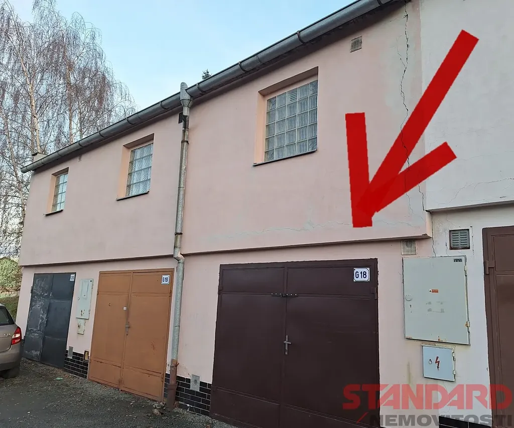 Jedná se o řadové, patrové zděné garáže. Pronajímaná garáže na vlastním pozemku o ploše 25 m2 je situována v přízemní. Konstrukce je zděná, střecha pultová, pozinkovaná. Stav objektu odpovídá běžné údržbě, fasáda není zateplená.