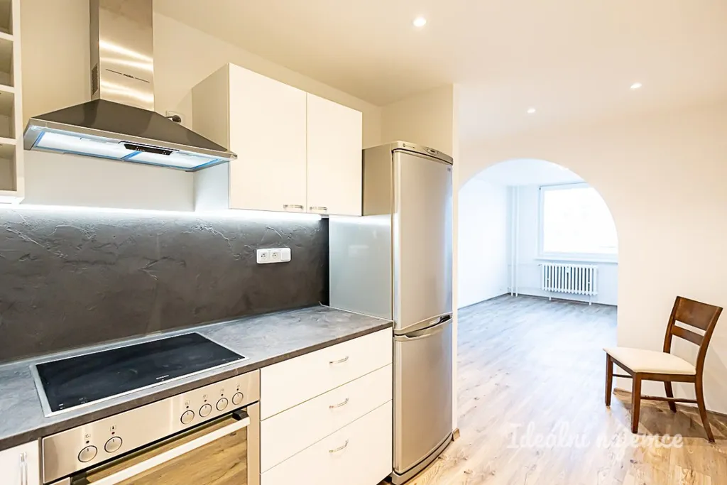 Byt prošel kompletní rekonstrukcí a nabízí se volný k zařízení dle vlastních představ. Nová kuchyňská linka disponuje lednicí s mrazákem, myčkou, elektrickou troubou, varnou deskou, mikrovlnnou troubou a digestoří. Obývací část je nezařízená, stejně jako obě ložnice. V koupelně je sprchový kout a koupelnová skříňka se zrcadlem. Toaleta je umístěna samostatně.
