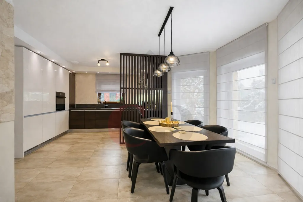 Vstup do domu zajišťuje prostorná chodba s vestavěnými skříněmi. Interiér je nadstandardně zařízený a vybavený. Dominantou domu je prostorný obývací pokoj propojený s jídelnou a kuchyní.