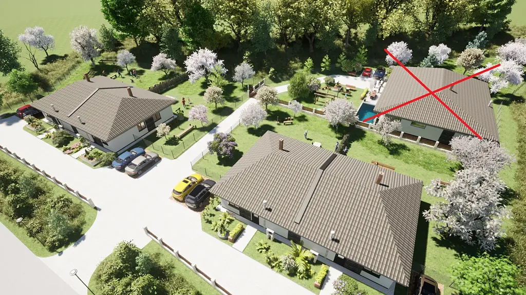 Parcela je umístěna v lokalitě, která byla projektována jako rezidenční bydlení, které zahrnuje 3 parcely na kterých jsou umístěny dva přízemní dvojdomky a jeden samostatný přízemní RD. Vjezd z hlavní silnice na parcely lze uzavřít branou a všechny parcely tak společně oddělit, čímž je docíleno uzavřené rezidenční lokality.