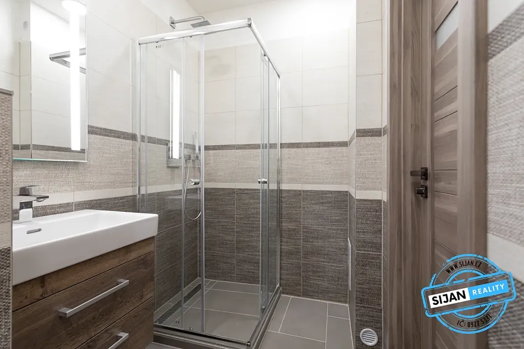 Moderně laděná koupelna byla navržena s důrazem na funkčnost i čistý design. Koupelna disponuje sprchovým koutem, umyvadlem s koupelnovým nábytkem, toaletou a prostorem pro pračku s horním plněním. Použité obklady a sanita podtrhují současný styl interiéru a zajišťují snadnou údržbu i dlouhou životnost.