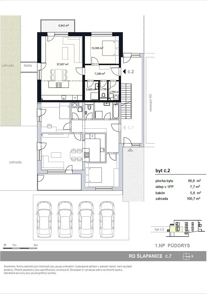 Dispozice: chodba 7,29m2, obývací pokoj s kuchyňským koutem 37,83m2 s přímým vstupem přes lávku na zahradu 106,7m2 a s balkonem 5,8m2, ložnice 13,36m2, koupelna se sprchovým koutem 3,6m2 a WC zvlášť 1,75m2 a technická místnost 2,75m2.