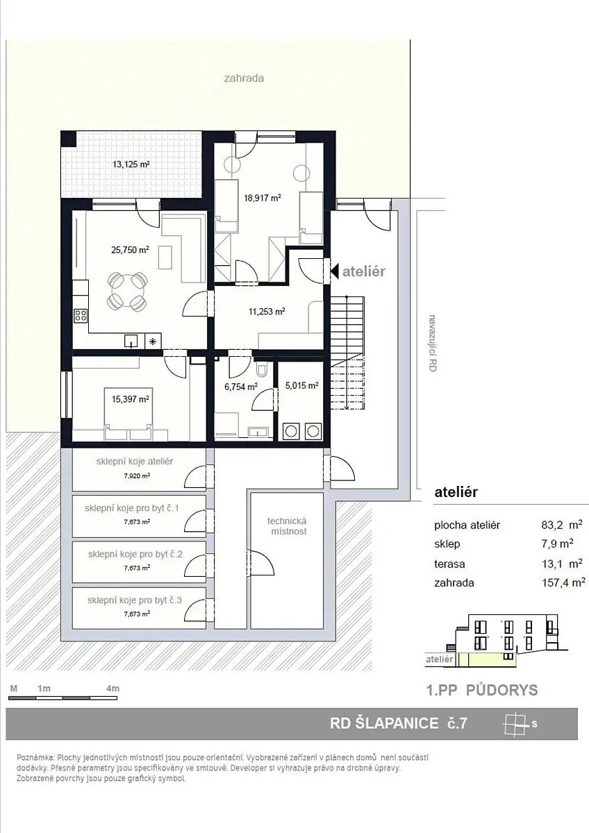 V tomto projektu nabízíme k prodeji ateliér 3+KK s terasou 13,12m2 a zahradou 157,4m2, sklepem 7,9m2 a 1 parkovacím stáním, vše je součástí kupní ceny. Možnost dokoupení dalšího parkovacího stání za cenu 300.000,-Kč.