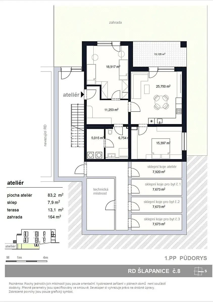 Byt č.3 o celkové ploše je umístěn v 1.PP