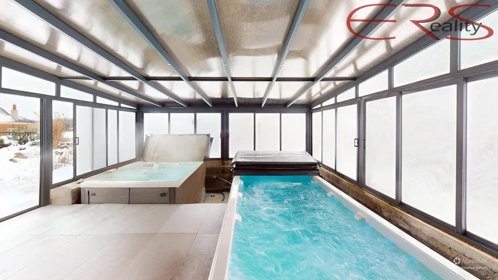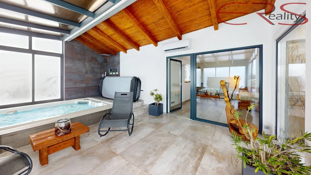 Dominantou objektu je prosklená wellness část o ploše cca 54 m², kde je vířivka pro 5 osob a Swimm Spa s protiproudem (plavání, masáže, jemný sprinkel). Velkou předností je možnost otevřít prosklenou část po celé ploše, takže v létě funguje jako vzdušná terasa a v zimě jako útulný vyhřívaný „zimní pavilon“ se světlem a výhledem.