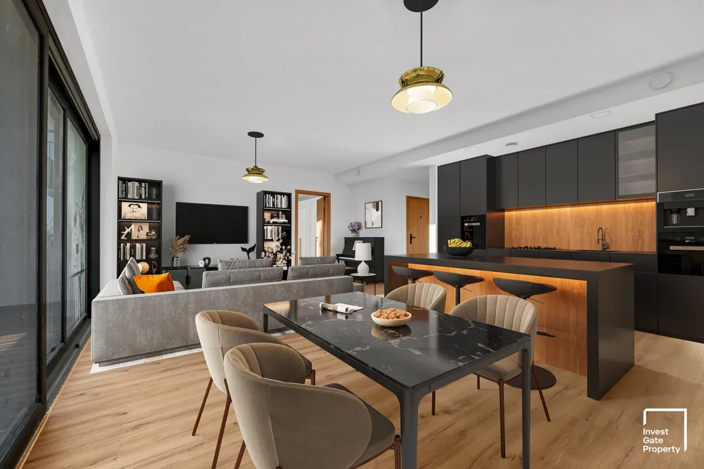 Byt má dispozici 4+kk o celkové ploše 120m2. Bytu dominuje prostorný obývací pokoj s kuchyňským koutem, ze kterého je přímý vstup na terasu a vlastní zahradu. Byt se dále skládá ze 3 ložnic, koupelny, WC a praktické šatny. K bytu náleží ještě komora před vstupem do bytu, pro uložení např. vašich sportovních potřeb. V ceně bytu získáte dále 2 parkovací místa před domem a zahradu o výměře cca 100m2.